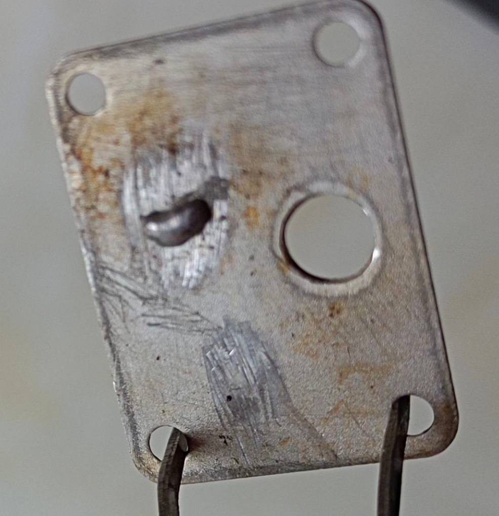 我今天焊接的,轻轻抠不容易抠下,用钳子夹会下来。结合面试一层稍显黑色的合金。但是,已经那么点焊接的意思了。为什么呢。因为热风枪风力很大,但是这个焊料融化后有点黏性,吹不走它。证明这个温度如果升的快。应该是可行的。这个不锈钢专用焊料。