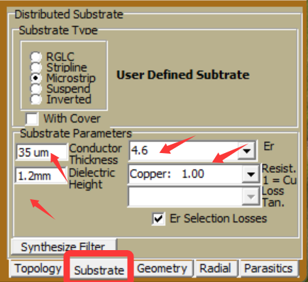 中间的箭头是说把电容均布在微带线的两边。这样只要目的就是一个,sma接口可以在比较中间的位置。整体比较对称。